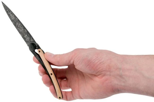 The Deejo Tattoo Juniper Wood 1920 Black 37g is part of the Deejo tattoo collection. The name says it all, these pocket knives are enhanced with artistic tattoos on the blade. This pocket knife has been enhanced with a flower tattoo and has a juniper wood handle. The tattoo collection demonstrates how artistic Deejo is. With such a tattoo each knife will get a newer, deeper meaning. Like paintings these pocket knives can definitely be called works of art!