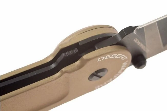 “Full size” folding knives, suitable for professional use by the military and law enforcement. Classical handle provided with bridge-clip. “Tanto” pointed blade. Blade length: 8,5 cm. Desert style coating.