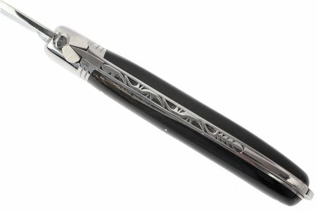 Classic French handcrafted Laguiole pocket knife. Folded length: 12 cm. Exclusive design with blade manufactured from 12c27 steel. Equipped with handy locking mechanism. Handle with casing made of black buffalo horn, decorated with the traditional metal cross design. The handle on each knife is unique.